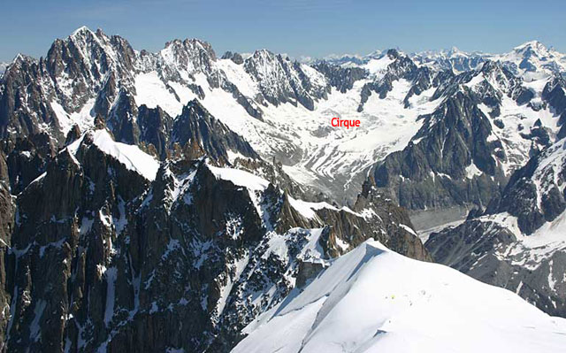 Snowy mountains with the cirque clearly visible and labelled. The Scottish word for the same feature is corrie.