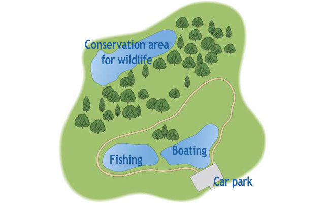 Many of them are quite close to cities, allowing people to enjoy a stretch of public countryside close to home. Nevertheless, they are often zoned so that different people can enjoy them in different ways, as well as giving the opportunity for wildlife to thrive. Areas closest to car parks are used for sports, while areas farthest away are used more for wildlife, hiking and conservation. That is what is shown in the diagram above.