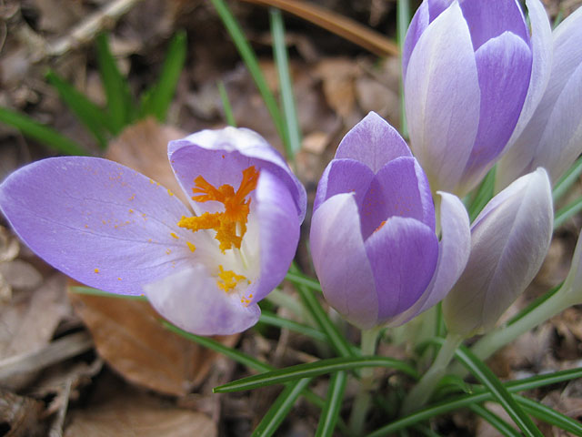 Crocuses are native to woodland and meadows from sea level to alpine tundra. They produce a short-lived blue to purple flower that comes out of a short stem.