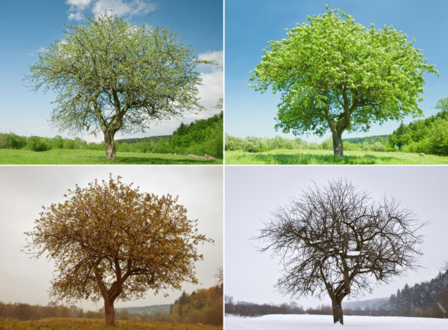 Many trees are deciduous. They shed their leaves to adapt to the changing weather conditions. In some parts of the world trees shed their leaves as the weather becomes colder and the ground freezes. In other parts of the world trees shed their leaves because the weather has become hot and dry. In both freezing ground or dry soil there is little water for the tree roots to take in. Deciduous trees have broad leaves which need large amounts of water to make food. If the water is not available in the soil the trees shed their leaves and live off the food stored in their wood. When the weather changes and there is water in the soil the deciduous trees sprout new leaves.