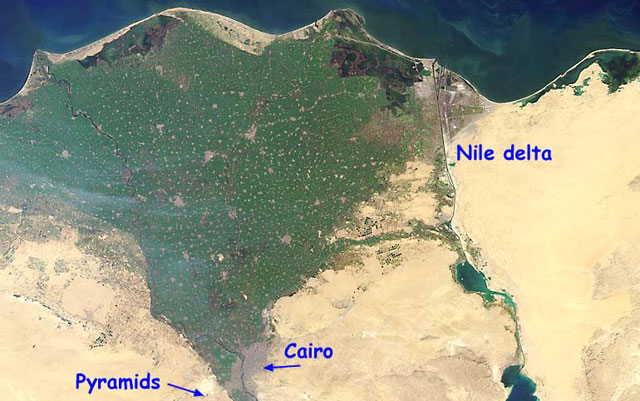 There are two common types of delta. One is called a 'bird's-foot delta', which has many long fingers reaching out into the sea. You get this when a river delta has a few major channels on it. The Mississippi has a delta of this kind. The other kind is a 'fan delta' like the Nile shown above, and is produced when the river splits up into many small channels as it reaches the sea.
