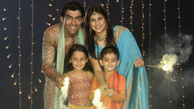 Before Diwali night, people clean and decorate their homes and offices. On Diwali night, Hindus dress up in their best clothes, light (lamps and candles (called diyas) say family prayers (puja) to the goddess Lakshmi – who represents wealth and prosperity. After the puja fireworks are lit and a family feast with special sweets (mithai) are eaten and gift are exchanged (as Christians might do at Christmas). Also, just like Christmas, the time before and during Diwali is a major shopping time as people go out to buy their gifts.