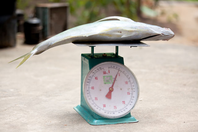 The weight of the fish is being measured on these scales.