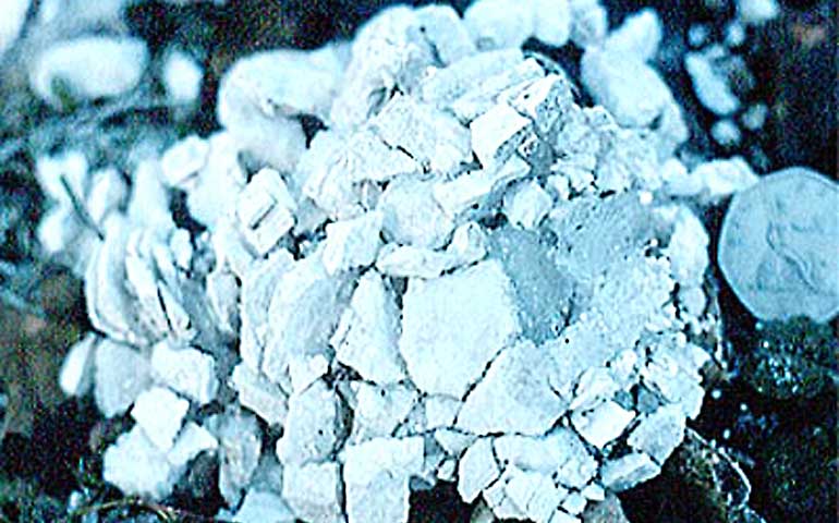 The process of breaking up a rock naturally is most commonly a result of cold weather. Imagine it has rained and soaked a rock. Some water has got down into cracks between blocks. It is winter, and overnight it gets very cold and freezes. The water turns to ice. Ice takes up more space than water and as it forms it pushes the surface block out from the main rocks. Later on these loosened blocks fall away.