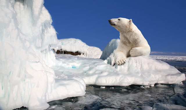 Global warming can threaten many kinds of wildlife. This is a polar bear on melting ice.
