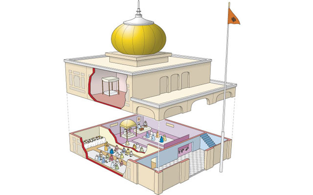 A gurdwara has a darbar (main) hall, a free community kitchen called a langar, and places where people can get together and learn or do other community things.