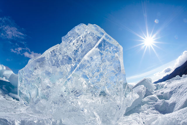 Ice is frozen water. There are many forms of ice. It can be snowflakes, hail or frost. It may form into icicles, and occurs on the Earth's surface permanently as glaciers, pack ice, and ice caps.