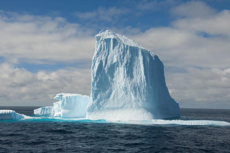 The word iceberg comes from the German, meaning 'ice mountain (berg)'. An iceberg is a large piece of freshwater ice that has broken off a glacier or an ice shelf and is floating freely in open water.