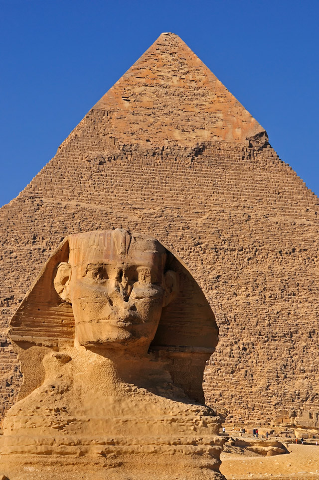 You can tell Khafre’s pyramid because it has a small amount of limestone facing on the top, and by the fact that the Sphinx is directly in front of it. When it was completed, it would have had a small pyramid stone on top to complete the shape. This stone would have been covered in gold leaf and would have shone out like a beacon in the strong sunlight of the desert.
