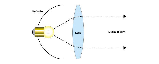 Note that both lenses and dished mirrors can make the light into a beam, although they work in different ways. This is why some torches only have a flat glass cover and not a lens in front of the bulb (see: reflector).