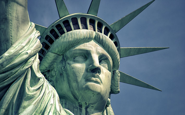The statue is of a robed female figure representing the Roman goddess Libertas. She holds a torch and a tablet carrying the date of the American Declaration of Independence, July 4, 1776. A broken chain is at her feet, representing the breaking of bonds with the former colonial power, Great Britain.