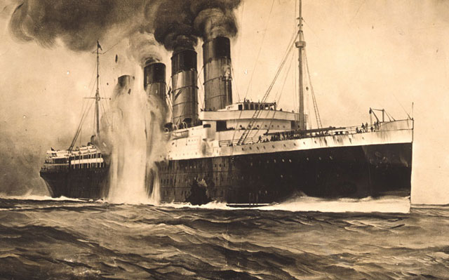 RMS Lusitania was a British ocean liner and the world's biggest ship. In 1915 she was torpedoed and sunk by a German U-boat, causing the deaths of 1,198 passengers and crew.
