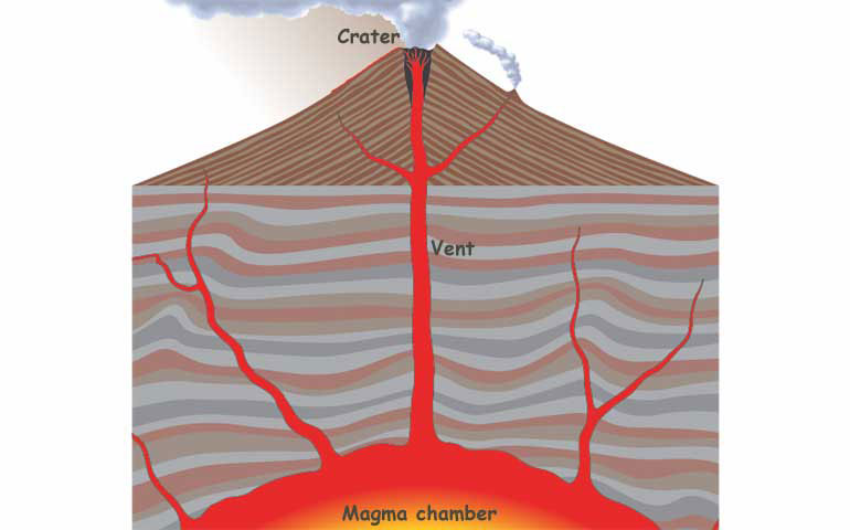 A volcano stores its magma in vast, underground magma chambers. Each chamber may be tens of kilometres across, and more than a kilometre deep.