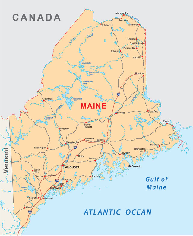 Located in the far northeast corner of the United States, Maine is the largest of the New England states. The Maine penninsula, West Quoddy Head, is the easternmost land area of the United States. Caribou is the country’s northeasternmost city. Maine can be divided into three geographic land areas: the Coastal Lowlands, the Eastern New England Uplands, and the White Mountains.