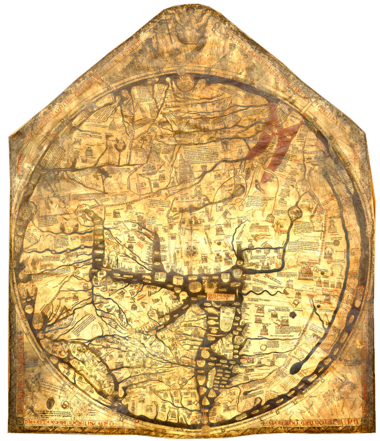 Today, maps of large areas are almost always drawn with north at the top, but that was not the case in the past. In the famous 1300 AD Mappa Mundi in Hereford Cathedral, England, for example, the top of the map is East. At that time most maps were drawn by people connected to the church, and to them the most important place to know about was Jerusalem, where Christ lived. So on this map (called a "T-O" map), Jerusalem is at the centre, east is at the top, Europe is at the bottom left and Africa is on the right. (The Americas and Australasia were not known about at this time in Europe).