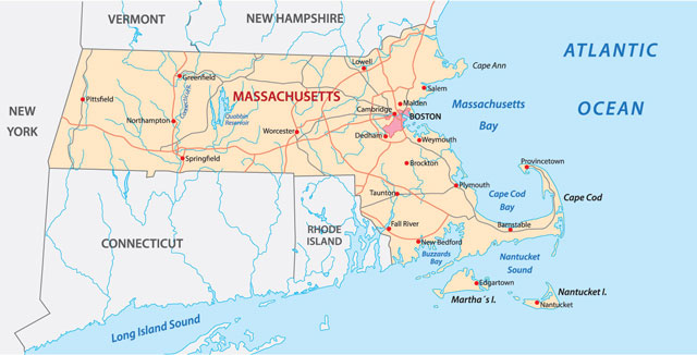 Although Massachusetts is only about 190 miles long, from east to west, it has six different geographic areas: the Coastal Lowlands, the Eastern New England Upland, the Connecticut Valley Lowland, the Western New England Lowland, the Berkshire Valley, and the Taconic Mountains.