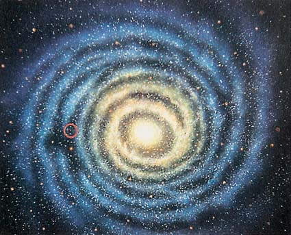 If you look into the Milky Way with a telescope you can see a huge number of stars. The Milky Way is really a huge group of stars called a galaxy. It is known as the Milky Way Galaxy. If you could look down on it you would see that it looks like a catherine wheel slowly turning in space. The Sun is just one of 500,000 million stars, and is found towards the edge of the Milky Way Galaxy. The Milky Way galaxy is so large that it takes light a hundred thousand years to cross it.