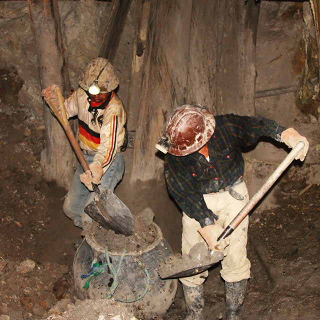 At the heart of these mountains were giant magma chambers that fed exploding volcanoes. The pressure in these magma chambers was immense, often cracking the rocks above. This allowed the most runny part of the magma to flow up, away from the chamber and into the cracks in the rocks above. Here it cooled, and metals and minerals changed from solids to liquids, according to the temperature at which they melted. Those with the highest melting points solidified first, those with the lowest melting points went farthest into the cracks and solidified last. As a result, each crack – which miners call veins – is a long thin source of wealth, with different metals and minerals along its length.