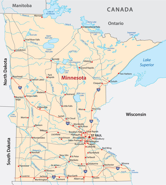 Lake Itasca, in the northwest, is the source of the Mississippi River. The Minnesota River, which flows across the southern part of the state, joins the Mississippi at the Twin Cities. The Red River of the North forms much of the boundary with North Dakota, and eventually empties into Lake Winnipeg in Canada. The Red River Valley is a plain which was created when the ancient Lake Agassiz dried up. Red Lake, Lake of the Woods, and Canada’s Lake Winnipeg are all remnants of this huge body of glacial meltwater.