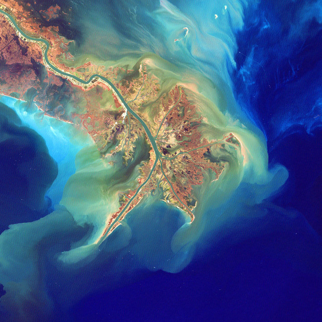 The Mississippi carries a huge load of mud and silt. The mud is what makes the river water look brown. When it finally reaches the Gulf of Mexico, it is some 2,320mi (3,730km) from the source. Here the swift river waters get mixed up in the seawater and much of the silt settles out to build the finger of land that we call the delta. You can see it in the picture above. You can also see how the sea currents then set to work on some of the mud and silt, moving it along the shore.