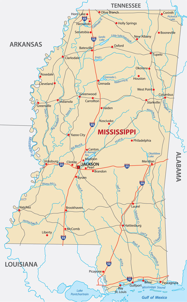 Mississippi has many rivers, creeks, and bayous which drain the state. The major river systems include the Tombigbee, which joins with the Tennessee to make up the Tennessee-Tombigbee Waterway, linking the Tennessee River with the Gulf of Mexico; the Pascagoula in the southeast; the Pearl in the south-central section; and the Mississippi and its tributaries in the west. These rivers and streams all empty into the gulf.