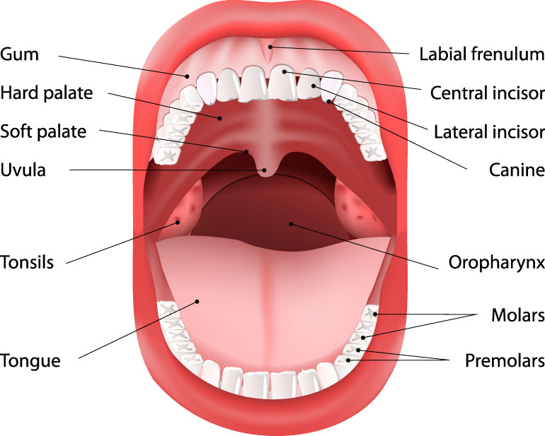 The mouth is always moist. There is a special lining that keeps releasing moisture. It is called a mucus membrane. It meets the skin in the lips. Look at your lips to see how the inside of the lips is a quite different surface to the outside.