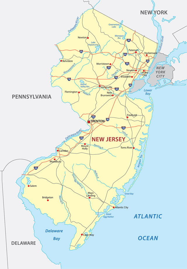 Lakes and ponds cover about 300 square miles (780 square km) of New Jersey. New Jersey’s major river is the Delaware, which is shared with Pennsylvania and makes up the western border between the two states. Over many thousands of years, the Delaware River sliced through the Kittatinny Mountain Range, forming a wide, deep water gap, or break, named the Delaware Water Gap. The Hudson River separates the state from New York. Other major rivers include the Passaic and the Hackensack, in the northeast, and the Raritan, which runs west to east. The largest natural lake is Lake Hopatcong, which is about 8mi (13km) long. Delaware Bay is a large estuary and the outlet of the Delaware River. It's an estimated 782sq mi in area, and its water mixes for many miles with the waters of the Atlantic Ocean.