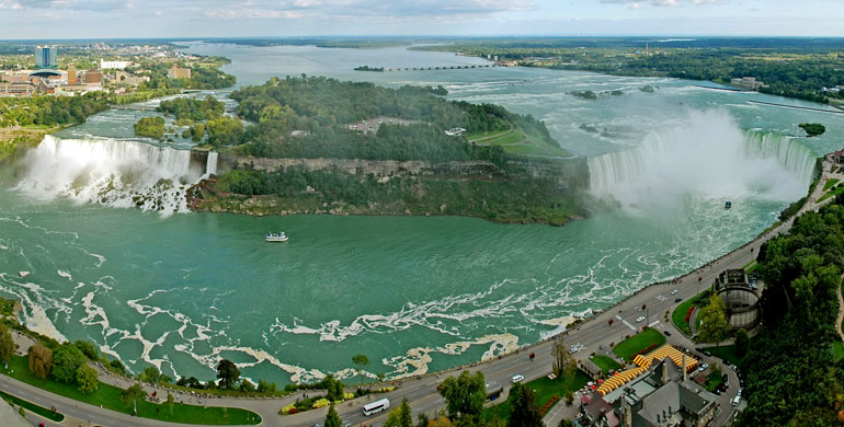 The Horseshoe Falls 188ft (57m) high and 2,600ft (790m) wide. The falls are part of the Niagara River, which is the outlet from Lake Erie. The green water is produced by dissolved salts. The falls retreat by 3ft (1m) per year. In 50,000 years the falls will have retreated all the way to Lake Erie.