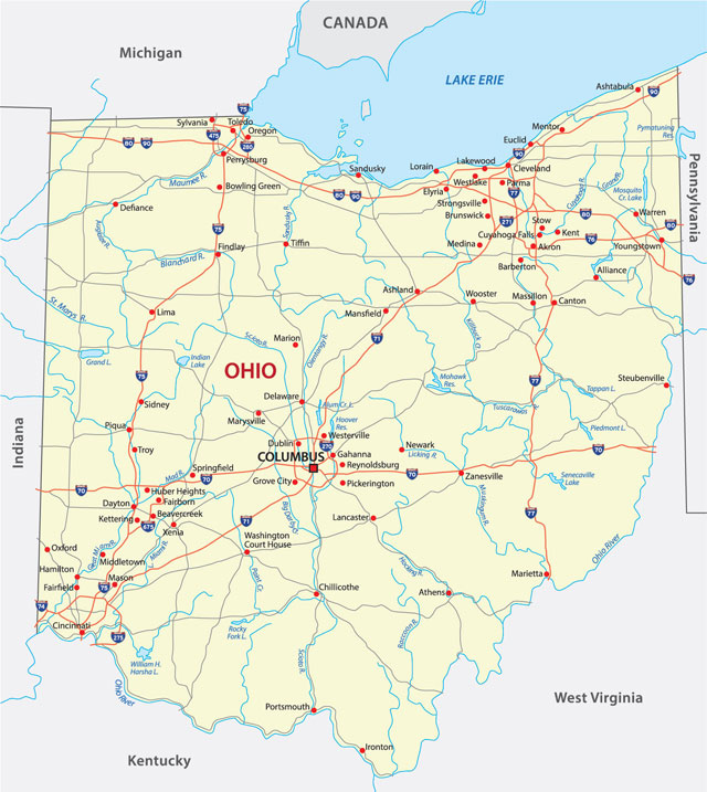 The Appalachian Plateau in is made up of rugged hills and steep valleys that become lower as they sweep westward toward the central plains. The highest point in the state is Campbell Hill (1,549ft/472m), located near Bellefontaine. The Erie lakeshore is an area of flat lowland that runs across the state to the Michigan border, and includes sandy beaches. The Central Plains are made up of undulating hills which decrease in height as they reach the Ohio River, which forms the state’s southern boundary with Kentucky and West Virginia. The state’s lowest point (433ft/132m) is in this region, at the confluence of the Miami and Ohio rivers, near Cincinnati.