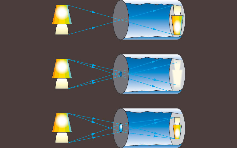 A picture forms in the pin hole camera because light rays travel in straight lines. Some light rays from the top of the reading lamp, pass through the pin-hole and form part of the picture at the bottom of the greaseproof paper. Some light from the bottom of the reading lamp passes through the pin-hole and forms part of the picture at the top of the greaseproof paper. This change in position of the light rays means that the picture of the reading lamp is upside-down.