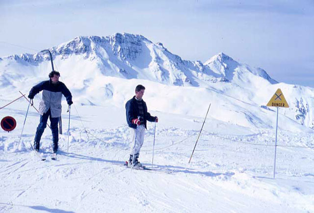 Skiers near the edge of a piste. Beyond the danger sign pistes