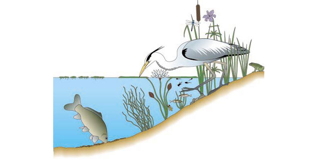 A pond can be as small as the kind you find in a garden. It can be a large area in a public park. But whatever its size, it gives a place (habitat) for wetland plants and animals to live. They don't just live in the water. They live in the banks, on the plants that grow out of the water, and so on. You can probably think of many pondlife examples, such as water-lilies, frogs, dragonfly and herons.
