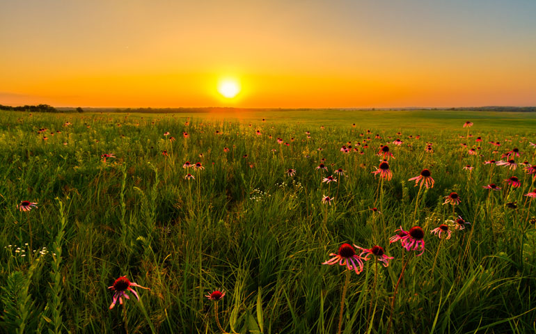 People think of prairies as places of grasses, but natural grasslands contain a whole range of flowering herbs, too. The plants nearly all have deep roots, and buds that are kept well below the surface and out of reach of fires. Fires burn off old and dead plants and create ash, which is a fertiliser. The plant roots go down deep to get to water in the dry summer.