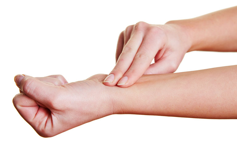 There are many places on the body where the pulse can be felt, but they are always where the artery is close to the surface and also just running across a bone. This means that, when you press lightly on the artery, the bone stops the artery pushing back into the body and so you can feel the pulse (wave) of blood flowing. The most common place for feeling the pulse is at the wrist, but other places are at the neck, on the inside of the elbow, behind the knee, near the ankle joint, and on the foot.