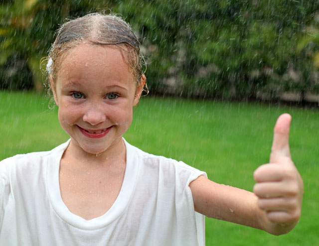 The longer this happens, the bigger the droplets of water become. They are held up in the sky because the air currents are still rising (think of how you could make bits of paper rise over a hair drier blowing a strong current of air). But eventually the drops become too big and heavy for the air to support them, and they fall out of the sky and make rain.
