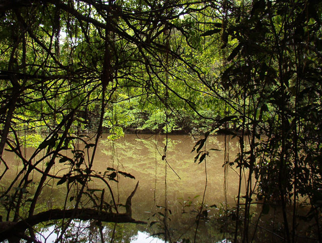 The forest trees have tall trunks which form a crown of branches up to thirty metres above the forest floor. The crowns of the trees grow close together to form a leafy canopy which prevents most of the light from reaching the ground.