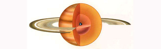 It has a small rock core surrounded by an enormously thick layer of metallic and liquid hydrogen, which in turn is surrounded by a hydrogen-helium atmosphere.