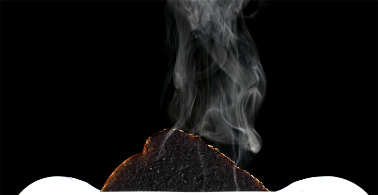 If a material is dry and it gets too hot, like burned toast, but not hot enough to make a flame, many PAH particles are given off and carried upwards by hot air. However, in this case, they do not get trapped by the food because it is fat free and dry. These smoke gas particles are small enough to be carried quickly across a room, and they easily get trapped in curtain fabrics, in clothes and even stick to the paint on the walls.