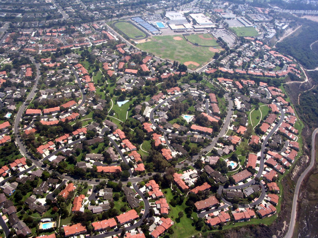 Sprawl is a term planners use to describe the way that the suburbs spread out around a city. The reason they do this is that cities used to be very tightly packed. Originally they were like this because there were far fewer people than today, and because most people had to walk to where they wanted to get to, and even the wealthy few had to go by cart. Nobody much had gardens, and most people therefore lived in the sort of city you find in the middle of cities today.