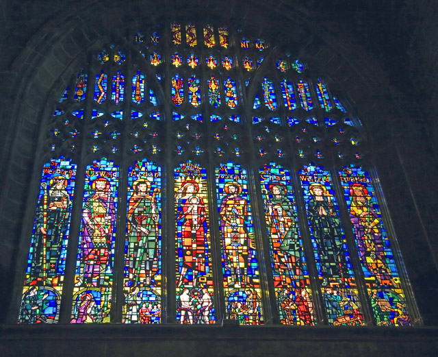 The stained glass gives a light similar to the light you see from a TV, rather than the light reflected from the surface of a book. This is why it is especially vibrant, and has amazed people down the ages.