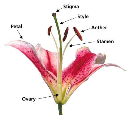 When the pollen grains are ready to be released the anther bursts open and turns inside out. The stamens of insect pollinated flowers have thick stalks to prevent the stamen snapping as insects clamber over them. The stamens of wind pollinated flowers have long stalks which hang the anther out in the wind so the pollen may be carried away.