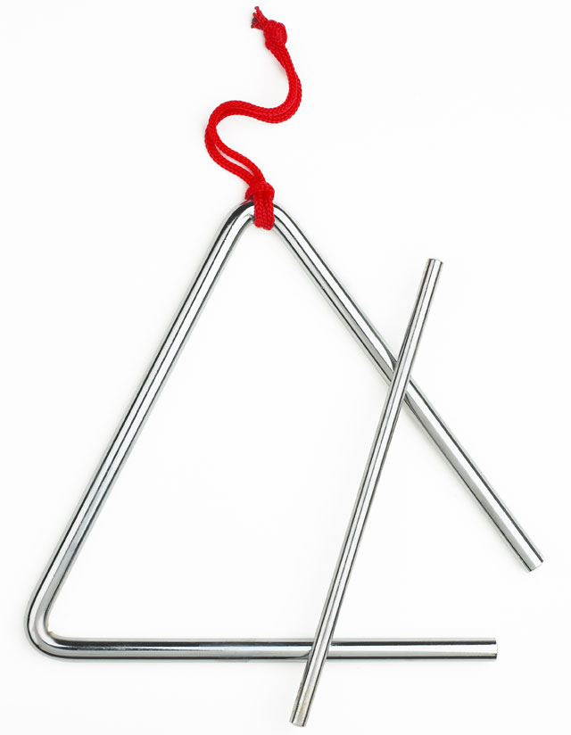 It is held by a loop attached to the top angle of the triangle. One end of the triangle is left open with the ends nearly touching. It is struck with a metal rod called a beater.