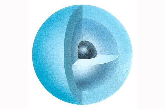 The solid part of the planet is made of rock and is about the same size as the Earth. At the centre is a core of molten rock.