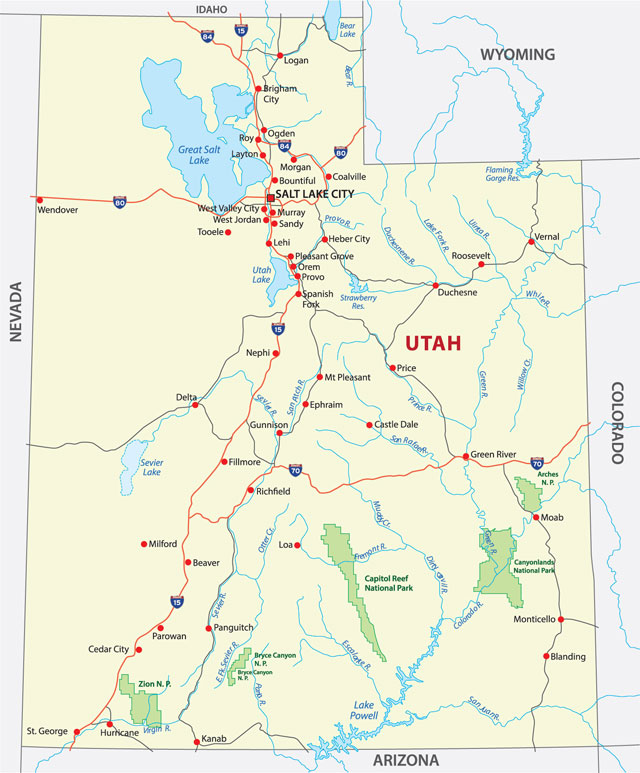 Utah includes six geographic regions. Around half of Utah is made up of the Colorado Plateau, where erosion has carved deep, colorful canyons, buttes, and mesas. The western third of the state is part of the Great Basin. This is a broad, flat, desert-like area with some mountain peaks. Streams and rivers in this region often disappear in the dry season. The lowest point in Utah (2,000 feet/610 meters above sea level) is at Beaverdam Creek in Washington County, in the southwest corner of the state. In the northeast part of the state are the Middle Rockies. They are made up of three mountain ranges—Bear River, Wasatch, and Uinta, which include the highest point in Utah—Kings Peak in the Uintas (13,528 feet/4,126 meters). Most of Utah’s major cities are located in a geographic areas called Wasatch Front, which lies at the western edge of the Wasatch Range. There are also two smaller regions - the Kaiparowits Plateau, in southern Utah, and the Overthrust Belt, in the north-central part of the state. These areas are rich in fossil fuels.