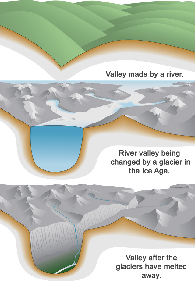 In hilly country, a river valley is normally V-shaped, with sides that slope down to the river sides. In lowland, there is often a floodplain by the side of the river channel. In mountain areas the river valley has often been changed into a U-shaped valley because, during the recent Ice Age, glaciers filled the valleys. Glaciers only scour the bottoms of their valleys, so they produce deep trenches with near-vertical sides; hence U-shaped.