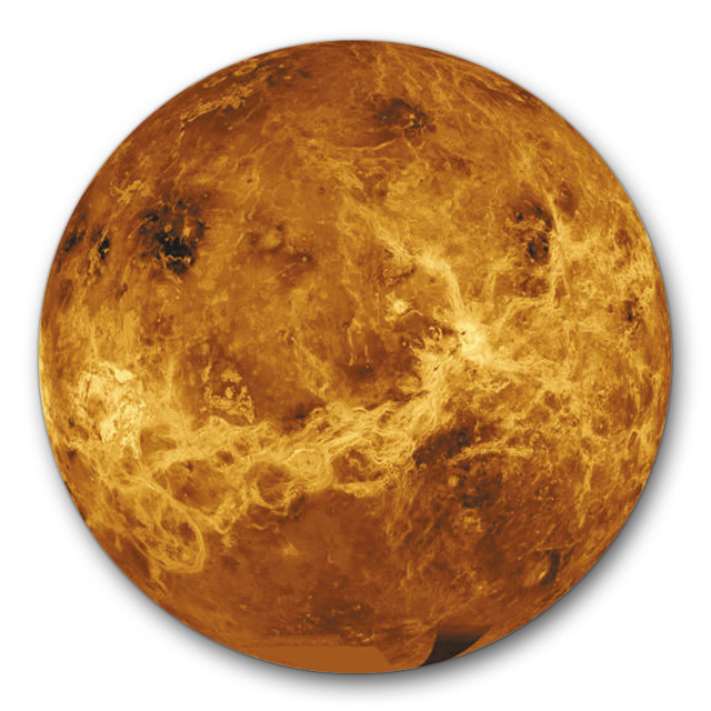 Venus is 12,100 kilometres across, about the same size as the Earth. However, it has one of the most hostile environments in the Solar System. The shining white 'surface' of the planet – which makes it the second brightest object in the night sky after the Moon – is actually an atmosphere filled with carbon dioxide and sulphur dioxide-rich clouds. From the clouds a rain of sulphuric acid droplets continually falls on the rocky surface.