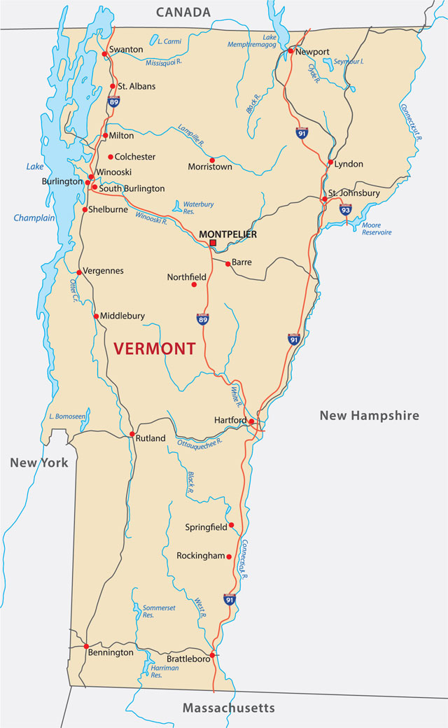 Vermont’s largest rivers are the Winooski, Lamoille, and Missisquoi rivers, which all flow into Lake Champlain. Lake Champlain’s waters, in turn, empty into Canada’s Richelieu River and then flow into the St. Lawrence. The longest river entirely within the state is the Lamoille (85 miles/135 km), followed by Otter Creek (75 miles [120 km]). Several small streams also flow from the central highlands into the Connecticut River. The largest of these is the White River. Vermont also includes around three-fourths of Lake Champlain (the western portion of is in New York, while one-fourth of Lake Memphremagog—lies in Canada. There are 400 natural lakes in Vermont. The largest is Lake Bomoseen, west of Rutland.