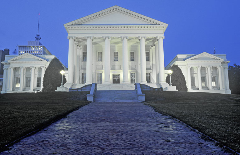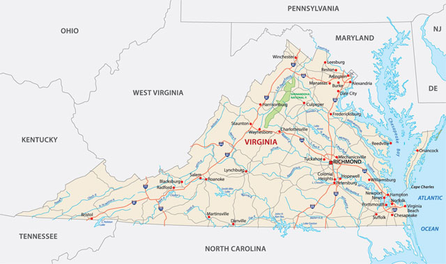 Virginia has three main geographic areas: the Piedmont, the Coastal Plain, or Tidewater, and the Blue Ridge region. The HYPERLINK "http://www.britannica.com/" Piedmont region, in central Virginia, is made up of low rolling hills, reaching from the Blue Ridge to the HYPERLINK "http://www.britannica.com/" fall line, the place where rivers descend, often in rapids, from higher areas onto the flatter coastal plains. The Piedmont includes the Great Appalachian Valley (also known as the Great Valley). To the east, the Coastal Plain region—or Tidewater—is between the fall line and the Atlantic coast. This area includes many tidal rivers and the Northern Neck Peninsula, the Middle Peninsula, and the Virginia Peninsula—all west of Chesapeake Bay. The HYPERLINK "http://www.britannica.com/" Tidewater also contains the area south of the James River, which includes Norfolk and the Great Dismal Swamp, which spans 750 square miles (1,940 square km) and extends south into HYPERLINK "http://www.britannica.com/" North Carolina. The Blue Ridge region is made up of the rugged Blue Ridge and Allegheny mountains, which are part of the Appalachian Mountain chain. The state’s highest point, Mount Rogers, at an elevation of 5,729 feet (1,746 meters), is in the HYPERLINK "http://www.britannica.com/" Blue Ridge area. The third region