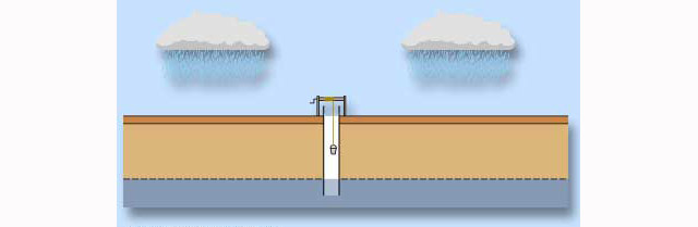 A diagram of a well reaching down to rocks containing water.