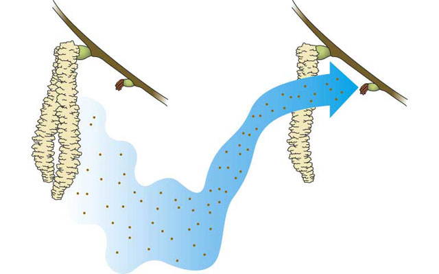 The stigma of a wind pollinated flower is large and divided up like a fluffy feather. This makes a net which hangs outside the flower. Pollen hitting the stigma becomes stuck to its sticky surface. A grass plant produces large numbers of wind pollinated flowers on the tip of a stalk. Trees like the hazel produce groups of wind pollinated flowers called catkins which hang down from twigs in early spring.